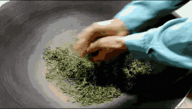 一斤三两的鲜叶,用铁锅炒到水汽蒸腾,大概只能出干茶三两。炒1斤大致需要7万棵茶芽,这意味着7万次采摘和7万次挑拣。杀青的温度差不多要320度~330度左右。整个炒茶工艺四五十分钟,一天十几个小时下来,炒茶人的手掌都会褪一层皮。