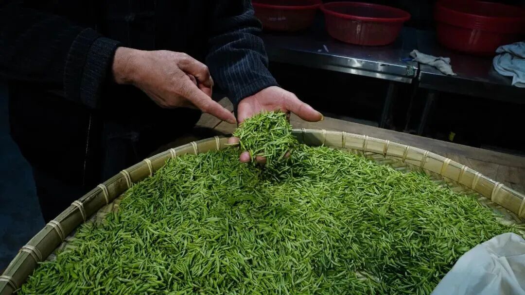 采茶工从早上5点多上山,一直到下午的两三点将当天采回的茶青,精心挑拣,自然通风萎凋后,再分筐分锅炒制。